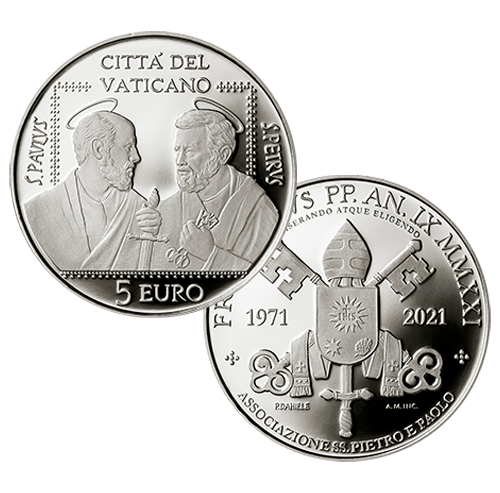 MONETA IN ARGENTO DA 5 EURO 50° anniversario dell’Associazione SS. Pietro e Paolo &nb...