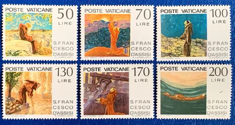 Nel mese dedicato a San Francesco, il Museo di Roma ospita una mostra con documento eccezionale: la copia più antica a noi pervenuta (nella foto in alto, un dettaglio) del Cantico delle Creature, componimento del Santo patrono d’Italia a 800 anni dalla stesura. Lo scritto è annoverato tra i primi esempi di poesia in volgare italiano. Laudato Sie!, questo il titolo dell’evento romano, comprende 93 manoscritti e libri del Fondo antico della Biblioteca Comunale di Assisi, la cui conservazione è presso il Sacro Convento della città. La mostra si articola in sezioni tematiche e si avvale anche di apporti tecnologici. Sono stati diversi i francobolli “francescani” di Italia e di altri paesi; tra questi, una serie del 1977 del Vaticano per il 750° anniversario (UNIFICATO n. 610/615) che contiene riferimenti al famoso cantico.