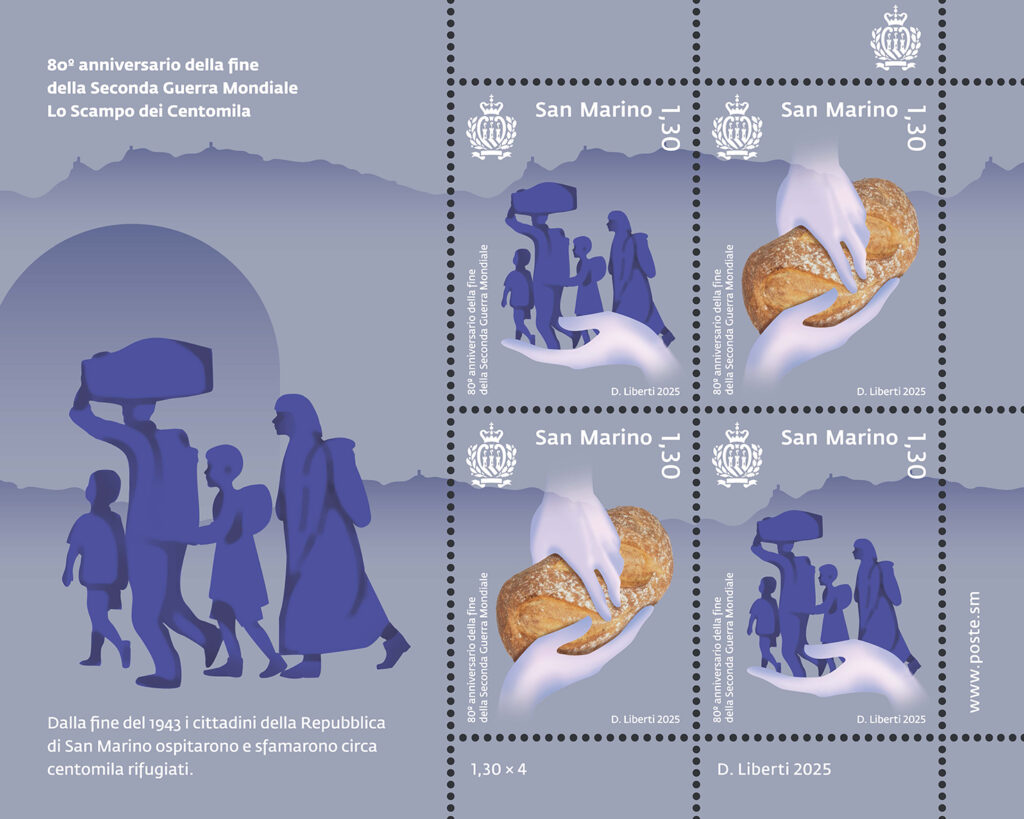 Nel cuore della Seconda Guerra Mondiale, un piccolo Stato si rese protagonista di un atto di straordinaria umanità: San Marino accolse oltre 100.000 rifugiati in fuga dal conflitto, nonostante una popolazione di soli 15.000 abitanti. Oggi, Poste San Marino rende omaggio a questo capitolo eroico con un’emissione filatelica speciale, dedicata all’80° anniversario della fine della guerra. I due francobolli, realizzati dall’artista Domenico Liberti, raccontano con forza visiva l’epopea di quei giorni. Uno raffigura gli sfollati, simbolo del dolore e della speranza di chi cercava riparo; l’altro il pane, emblema di solidarietà e nutrimento offerto con generosità dal popolo sammarinese. Elementi come le gallerie ferroviarie, trasformate in rifugi sicuri, sottolineano la determinazione di San Marino nel proteggere le vite umane durante il periodo più buio della storia moderna.