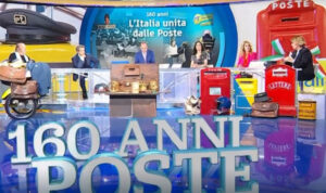 Rievocazione storica in TV per il 160° anniversario di Poste italiane. È successo lo scorso 5 maggio nella trasmissione Porta a Porta, condotta da Bruno Vespa e alla presenza della presidente, Maria Bianca Farina, oltre a VIP dello spettacolo; tra questi, Maria Grazia Cucinotta e Lino Banfi. Al centro dei temi trattati il ruolo di Poste Italiane nella storia e nel costume nazionale con riproposizione di interpretazioni filmate di beniamini del piccolo schermo come Mike Bongiorno e Gino Bramieri. L’anniversario è stato salutato anche da un foglietto rievocativo con sei bandelle nelle quali si sono rilevate alcune incongruenze storiche e grafiche. Queste tuttavia non hanno inficiato il valore di un traguardo importante per l’Azienda di Viale Europa.