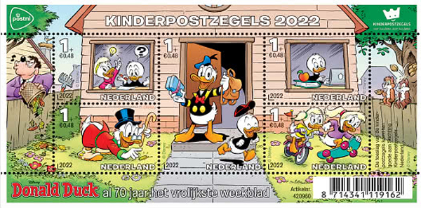 Compie 70 anni il magazine olandese dedicato a Paperino e per l’occasione le poste dell’Aia hanno fatto coincidere l’anniversario con la consueta emissione di beneficenza a favore della gioventù. Il ciclo è iniziato negli anni Venti dello scorso secolo con francobolli caratterizzati da sovrattassa. Quest’anno le donazioni andranno all’organizzazione Stichting Kinderpostzegels Nederland che si occupa di progetti di sostegno a giovani e bambini in difficoltà. In questa occasione mobilitati migliaia di studenti delle scuole primarie per vendere a scopi benefici prodotti diversi come borse, cartoline, biglietti augurali, persino cerotti in tema. Naturalmente anche francobolli. Sono cinque gli allegri valori inclusi nel foglietto che, una volta di più, nobilitano la funzione classica del fumetto. In questo caso, postale e solidale.