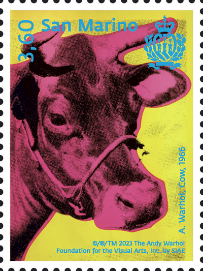 | Data di emissione: 9 maggio 2023 Valori: n.1 valore da euro 3,60 in fogli da 12 francobolli Tiratura: 20.004 serie Stampa: offset, un Pantone e inchiostro invisibile giallo fluorescente a cura di Cartor Security Printing Dentellatura: 13¼ x 13 Formato francobolli: 30 x 40 mm Credits: Andy Warhol, Cow, 1966, serigrafia su carta da manifesti, collezione privata ©/®/TM 2023 The Andy Warhol Foundation for the Visual Arts, Inc. by SIAE |