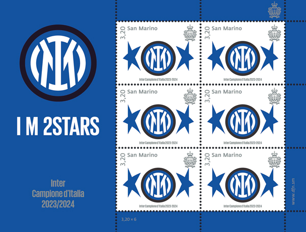 Lo stemma dell’Inter tra due stelle blu su sfondo bianco per un francobollo da 3,20 euro destinato a tifosi, collezionisti e semplici appassionati che sarà prodotto in 40.008 esemplari. A completare il valore le scritte “3,20”, “San Marino”, lo Stemma della Repubblica di San Marino in argento e la legenda “Inter Campione d’Italia 2023-2024”. La bandella a sinistra del foglio riporta in alto il logo della squadra F.C. Internazionale Milano con la scritta “I M 2STARS” e in basso la legenda “Inter Campione d’Italia 2023/2024”.