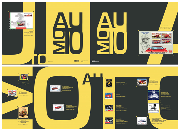 Questo nuovo prodotto, “Collezione passione Auto e Moto” dalla veste grafica molto elegante contiene quindici francobolli dedicati a: Ferrari Testarossa, Innocenti 650 SE, Ferrari Campione del mondo, Lamborghini Miura, Fiat 500. Moto Ducati, Moto Gilera, Alfa Romeo 24 HP, Giulietta nuovo modello, Targa Florio, Lambretta, Nuova Fiat 500, Fiat 120 anniversario, Pininfarina, Enzo Ferrari.