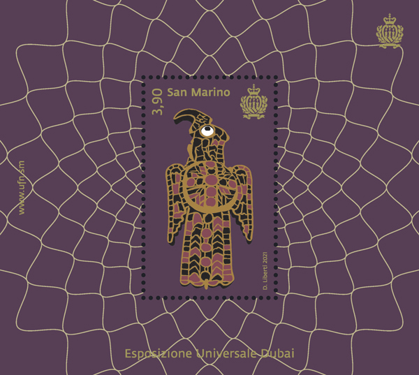 Il francobollo riproduce un’illustrazione ispirata alla fibula a forma d’aquila, capolavoro di gioielleria gota appartenente al Tesoro di Domagnano, rinvenuto a San Marino nel 1893, la cui fedele riproduzione verrà esposta presso il Padiglione della Repubblica di San Marino all’Esposizione Universale di Dubai dal 1° Ottobre 2021 al 31 Marzo 2022 (https://www.sanmarinoexpo.com/). L’emissione postale è impreziosita dalla lamina similoro che richiama l’oro della fibula.