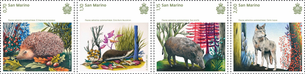 La serie di francobolli rappresenta quattro specie di mammiferi che vivono sul territorio sammarinese. Lupo e cinghiale, entrambi di grandi dimensioni, sono animali ben conosciuti che solo da pochi anni hanno cominciato a frequentare e a riprodursi nel nostro territorio. Di abitudini prevalentemente notturne, i cinghiali vagano in gruppi numerosi per le campagne in cerca di cibo costituito da tuberi, radici, frutti, lombrichi ed ogni sorta di alimenti vegetali e animali. Il lupo è invece prevalentemente carnivoro e caccia prede di grandi dimensioni come caprioli ed appunto cinghiali. Vive in nuclei familiari costituiti da circa 5-8 esemplari guidati da una coppia dominante. Il riccio e la crocidura ventre bianco sono, al contrario dei primi due, animali di piccole dimensioni che, seppur comuni, più difficilmente si possono osservare in natura. Entrambi assolutamente innocui, si nutrono di piccoli animali come lombrichi, chiocciole, insetti e loro larve. La presenza di questi due piccoli predatori in un determinato territorio indica il buon stato di salute dell’ambiente.